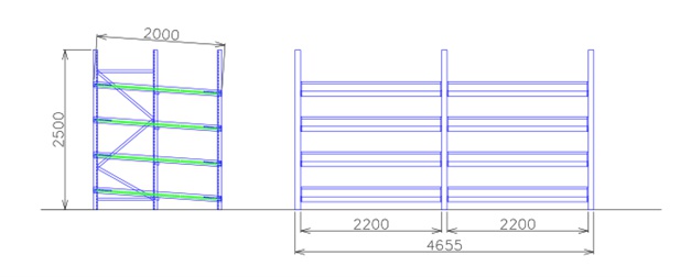 Délka regálu 2 pole 2200 + 3 stojiny = 4655 mm